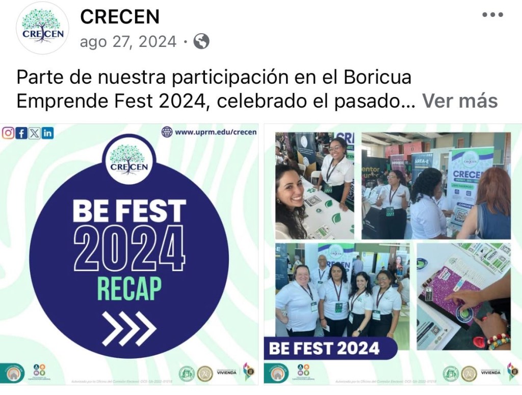 Participated in Boricua Emprende Fest (BE Fest) 2024, held on August 23 in Ponce, engaging with attendees at our informational booth and contributing to outreach efforts that promoted our initiatives at my program, CRECEN, and strengthened community connections.