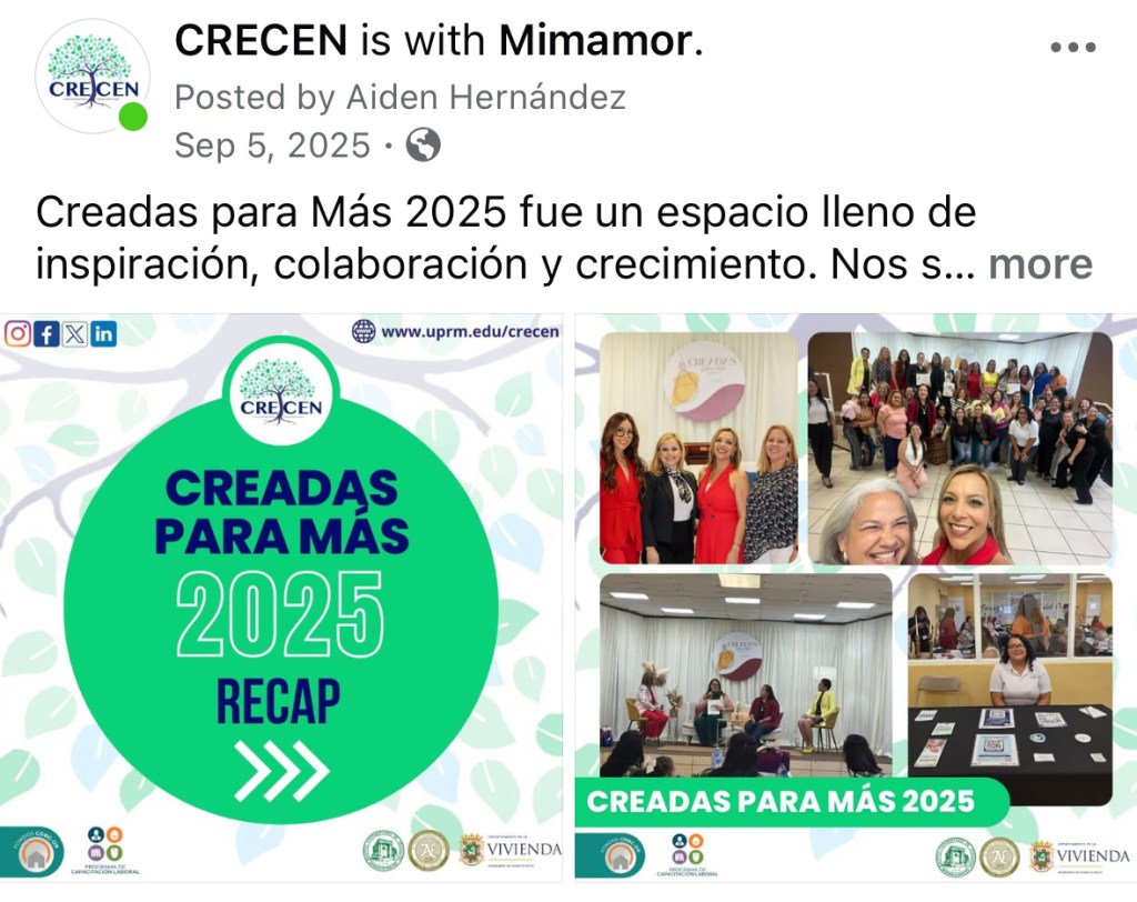 Participated in Creadas para Más (August 2025), contributing to an initiative centered on inspiration, collaboration, and community growth while promoting the CRECEN program and supporting efforts that strengthen leadership and resilience within our communities.