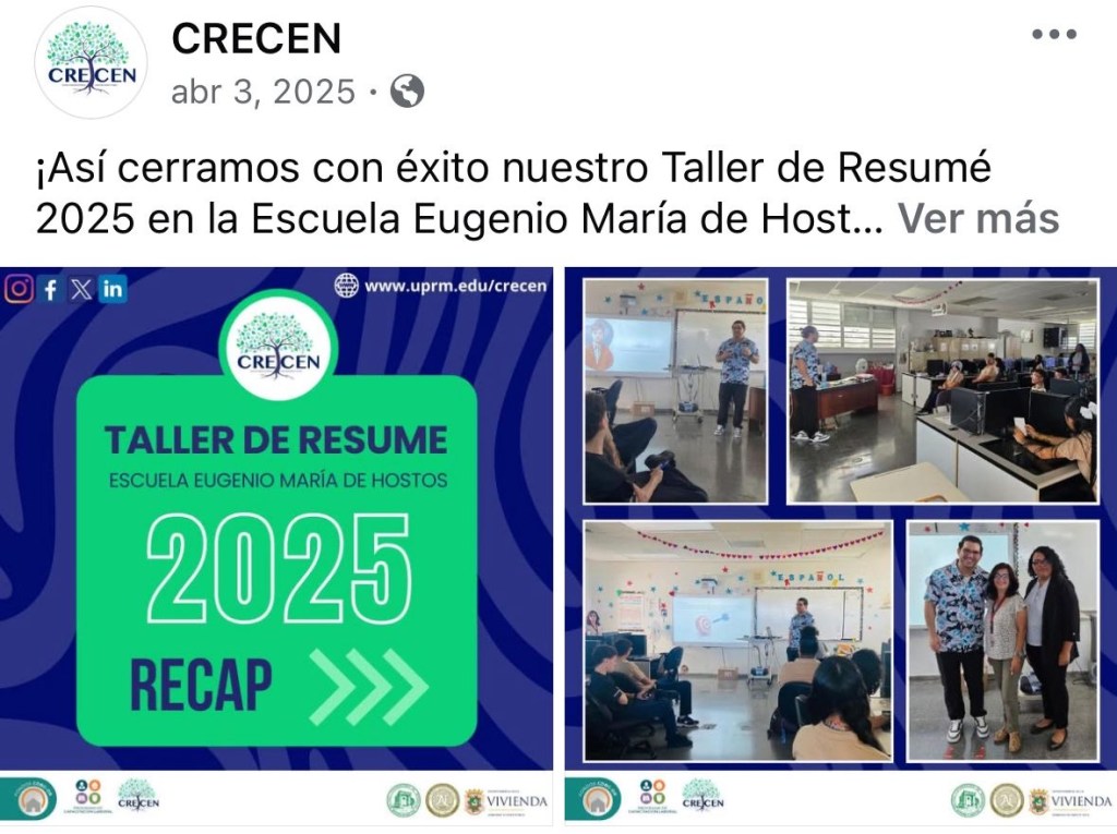 Contributed to the successful delivery of the CRECEN Résumé Workshop at Escuela Eugenio María de Hostos (March 2025), where our team provided students with essential tools for crafting effective résumés and encouraged them to prepare confidently for future academic and professional opportunities.